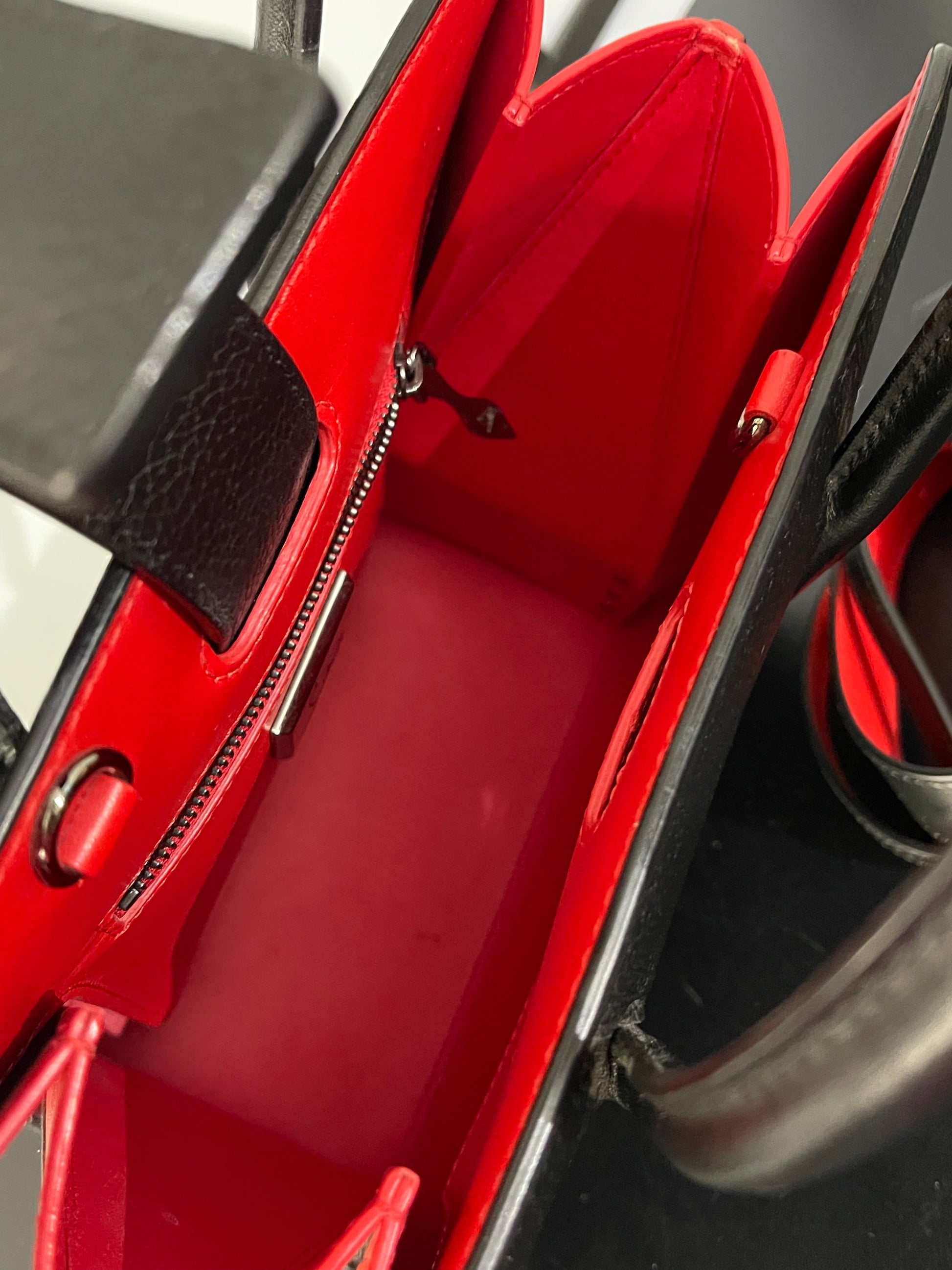 - The Christian Louboutin Paloma bag features a sleek black leather exterior. It's a pre-owned item, showcasing a timeless design. The bag includes red interior for a vibrant contrast. Stud detailing adds a touch of elegance. Perfect for those who appreciate classic style with a modern twist.