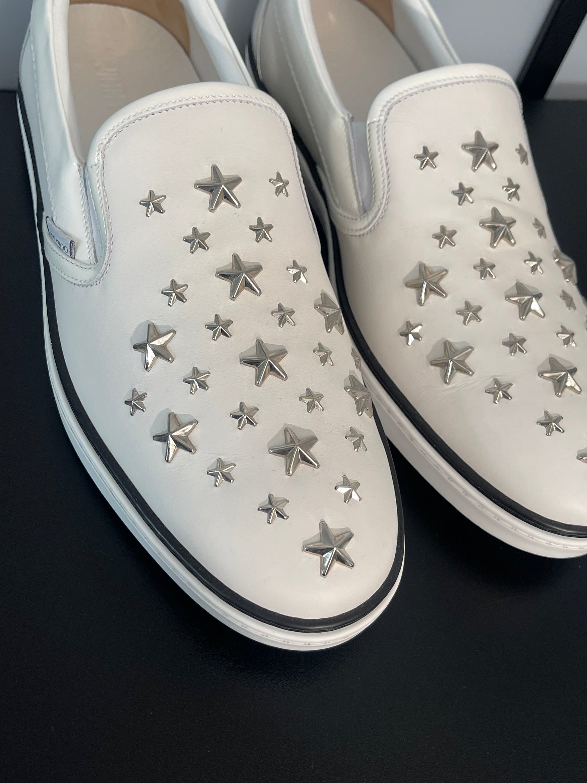 Step into style with the Jimmy Choo White Leather Slip-On Shoes, where comfort meets fashion.