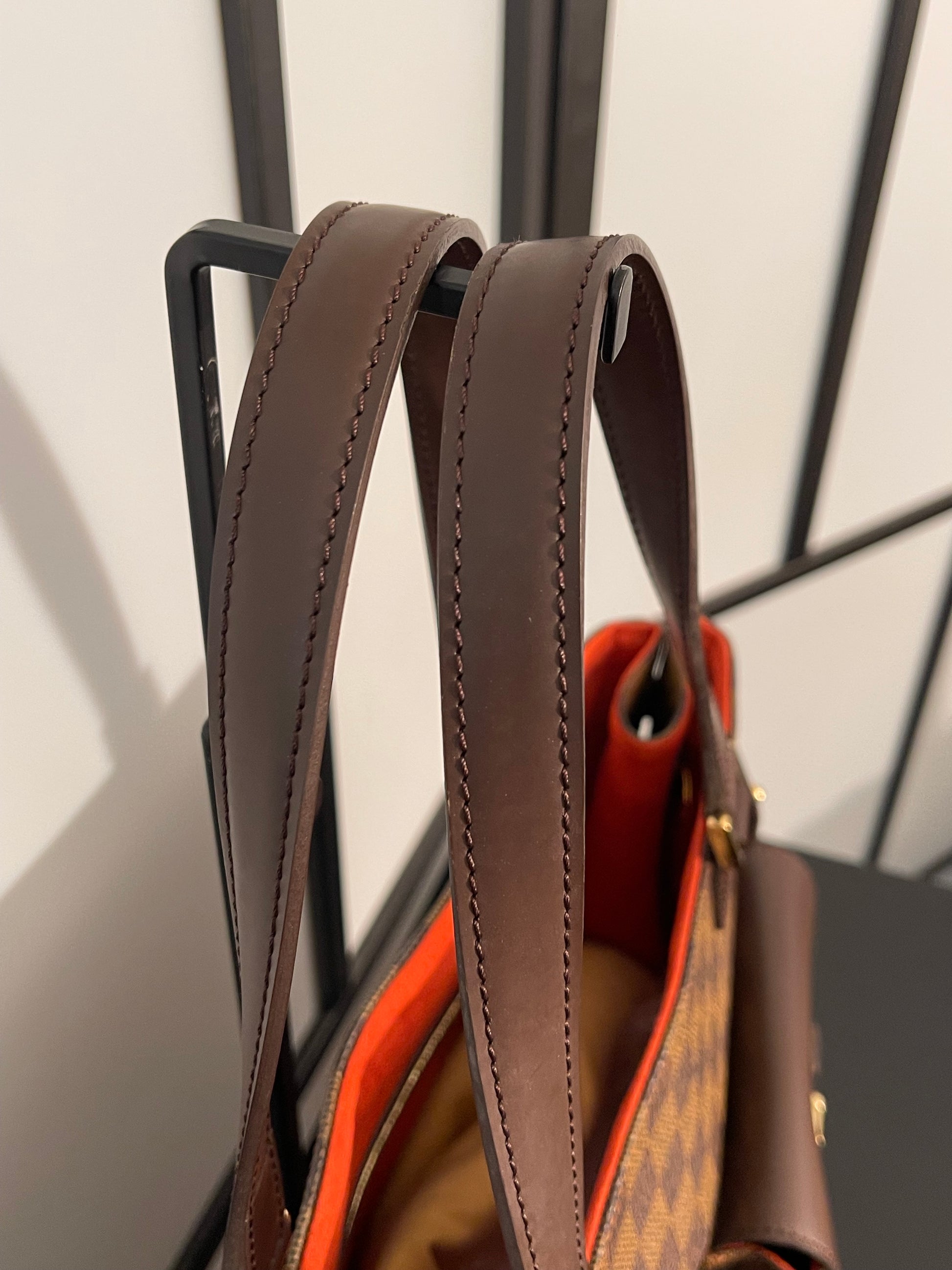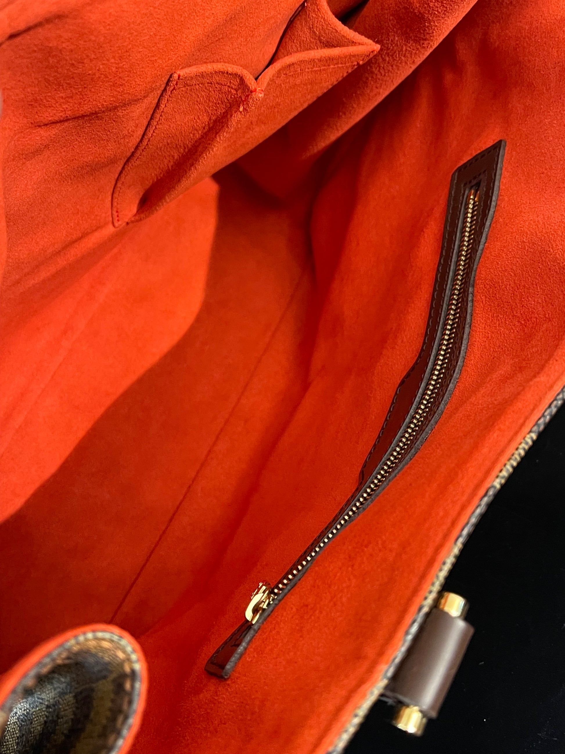 The canvas material ensures durability and a sleek look. The brown Damier Ebene pattern adds elegance. This practical shoulder bag combines functionality with style. Dimensions: Height 12in, Width 14in, Depth 7in.