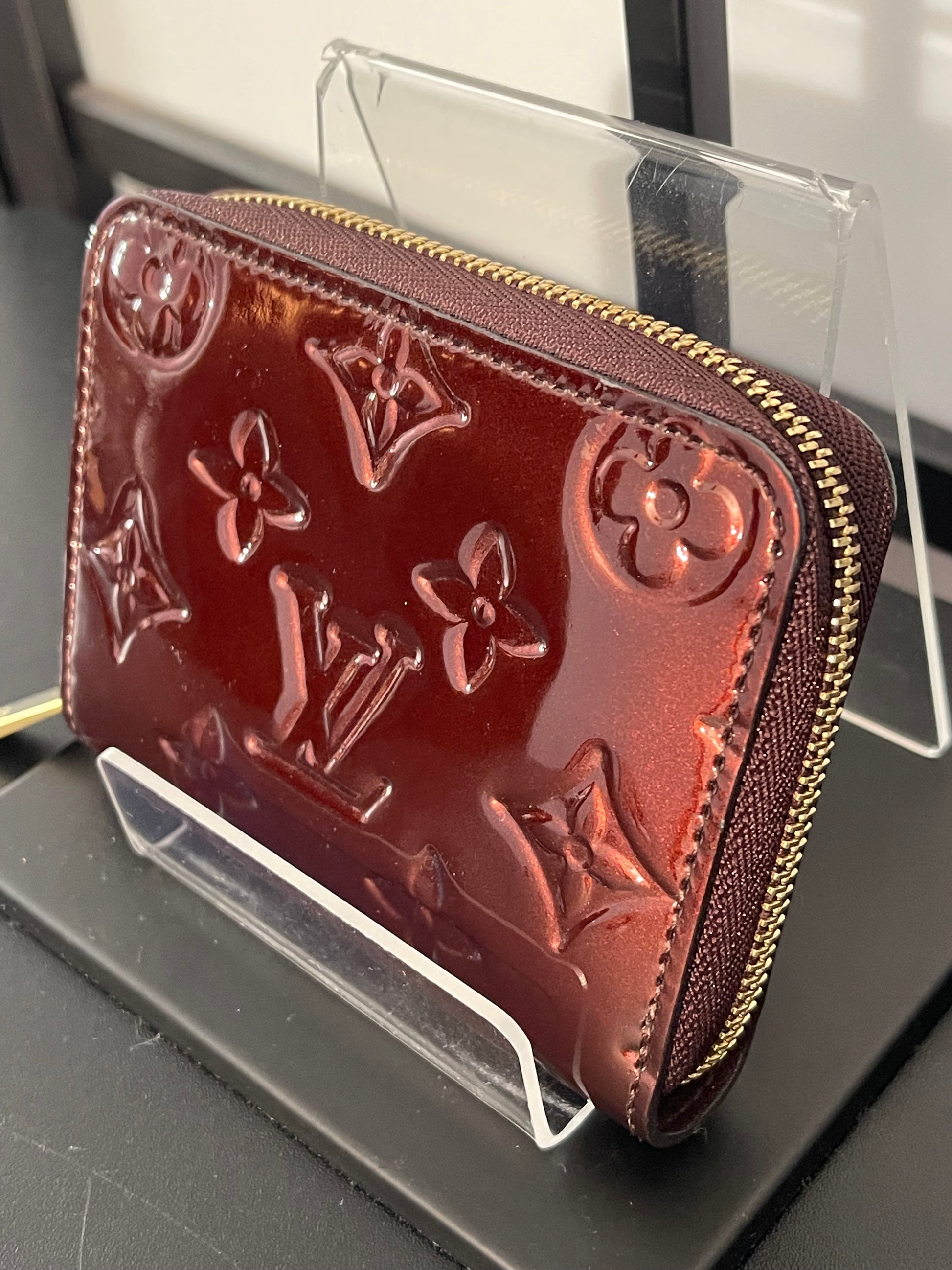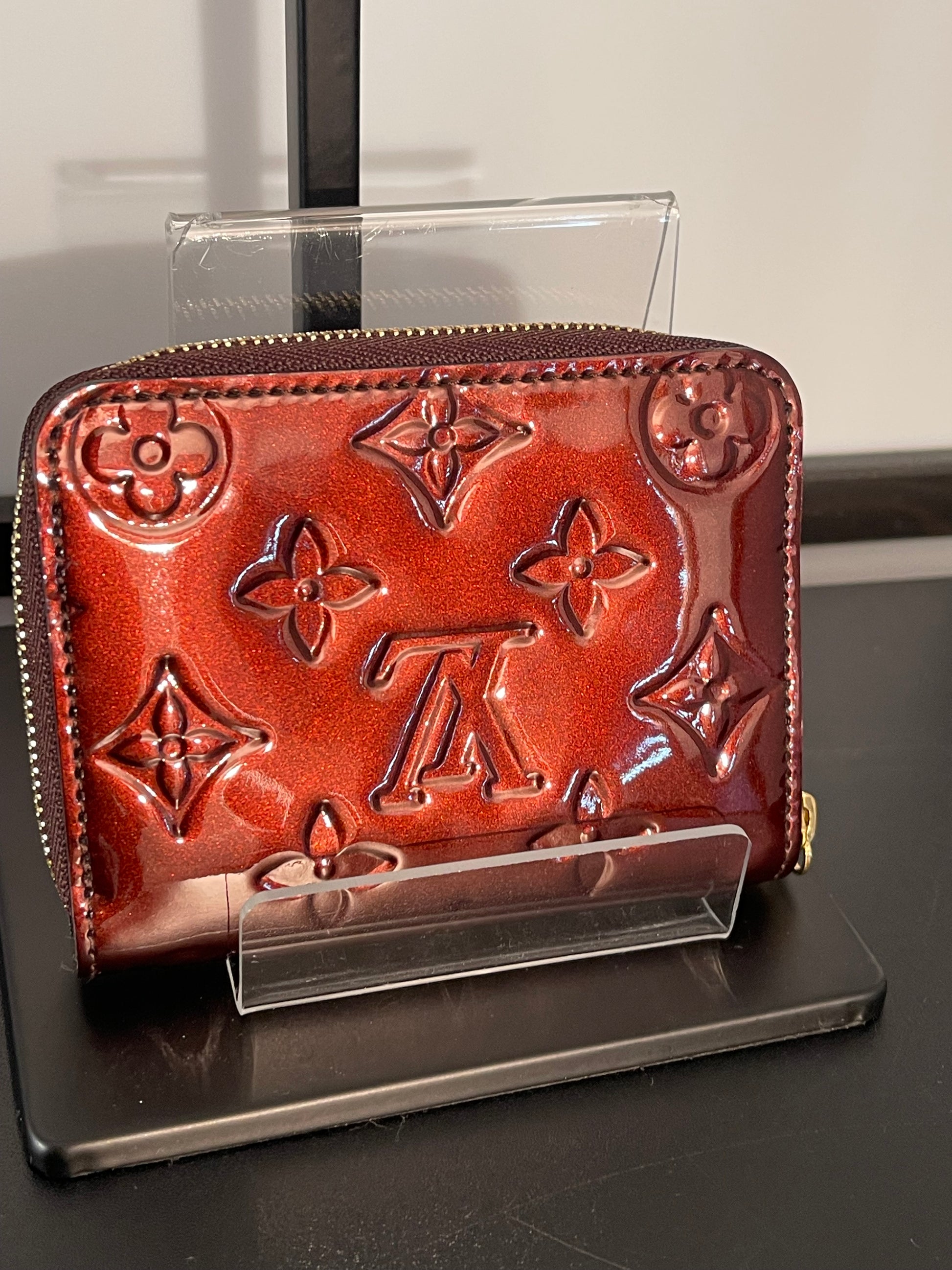 The Compact Vernis Zippy Wallet in Red features gold tone hardware and a monogram pattern. This stylish accessory is perfect for everyday use. The wallet's compact size makes it ideal for carrying essentials without bulk. Pre-owned, it retains its charm and functionality.